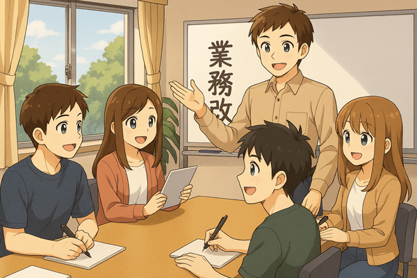 よるべ会では6 月19 日より、課長及び課長補佐 10 名が「業務改善ワークショップ」に参画しています。外部講師に坪茂典・一般社団法人グローバルカイゴ検定協会理事を迎え、 組織目標達成のためのマネジメント手法を学び、各部署での実践に落とし込んで成果を挙げることを目標に取り組みます。運営にあたり「障害福祉人材確保・職場環境改善等交付金」を活用し、令和7 年度中に計6 回のワークショップを予定しています。 制度をはじめサービス提供を取り巻く環境変化が続くなか、現場の対応力・実践力をより一層強化するために、「言われて(決められて)の統治~ ガバナンス~から、自ら確認し実践する自治~セルフガバナンス~へ !!」( 星野泰啓理事長によるキックオフ宣言)をめざして、受講者10 名が奮闘中です。
