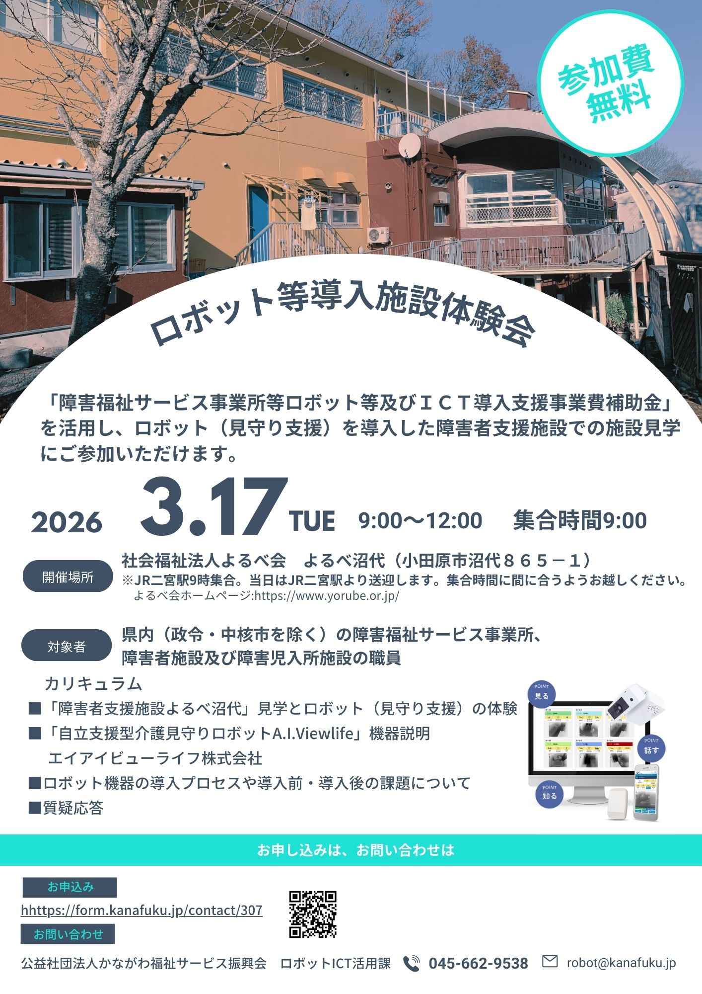 「よるべ沼代」で3月17日(火)に「ロボット等導入施設体験会」を実施します。神奈川県内の障害福祉サービス事業所・施設の職員が対象です。