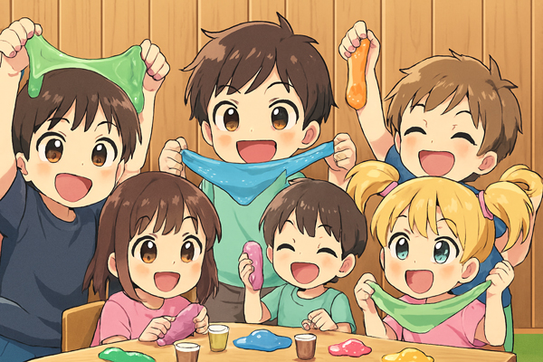 ▲感触遊び(スライム)を紹介します。みんなスライムが大好き!スライムが配られると歓声が上がり、ひんやりと冷たい感触を手のひら全体で味わっていました。綺麗な色やビヨーンと伸びる様子に夢中でした。