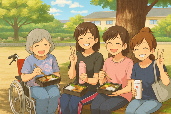 ▲9月21日日曜日のお昼、「あずさの家」の皆さんは近所の公園で昼食。いつもホームのリビングで食べているメニューをお弁当箱に詰めて出かけました。公園の木の下で気持ちよい風を感じながら食べるお弁当は一味違った美味しさがありました。(以上小田原地区 E・N)